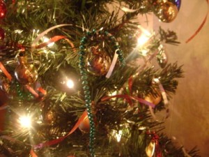 I was out and about, and I saw this beautiful Christmas tree. It had sections of metallic bead garland which had been cut into 8 inch or so pieces and hung on the tree. The way they hung them, the top was draped over to form the crook of a candy cane. They were all over the tree. It was so pretty,