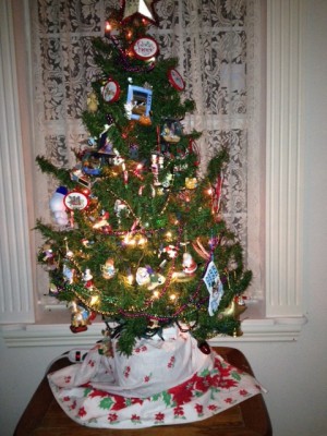 I knitted the tree skirt for my biggest tree, made one out of mattress ticking for my kitchen tree that has mattress ticking ornaments, and for the little tree I use in my dining room, I have an old apron one of my aunts had with poinsettias printed on it. It works perfectly. I wrap the sashes around the tree and tie a bow in front.