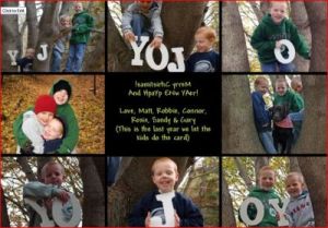 My 18-month old son would not cooperate for our holiday pictures, so I want to use the various pictures of my husband and I chasing him around the yard, trying to get him to sit with us, looking at the camera, etc. in a collage on a photo card. I need a clever greeting to go with it!