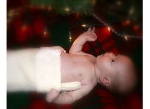 To show off our newborn daughter, I took an empty box and wrapped it like a gift with a bow showing on the side, but left the top of the box open. I placed a pillow in the box and printed out a large gift tag that read "Our gift from God." I placed her in the box and had big brother sit next to it. It was a hit! The Christmas tree was in the background. (11/13/2007)