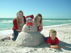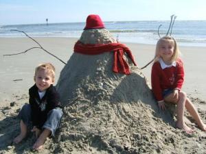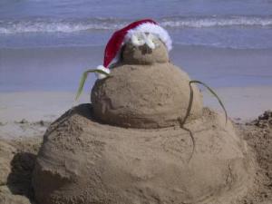 We often travel to the Caribbean in winter, so one year we brought a Santa hat with us and made a snow man out of sand and items we found on the beach.