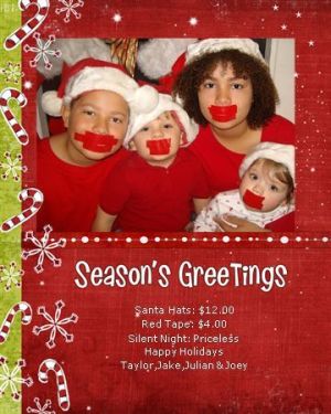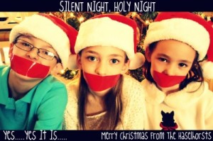 Last year we did the Duct Tape version, only the front of the card was very elegant & read "Silent Night" the inside had the caption "Why yes. Yes, it is" & there were my 3 kids, mouths taped. (They LOVED this one!)