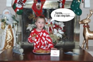 Last year I put a fire in the fireplace and a small lit Christmas tree next to it. I then placed my 2 year old in front of the fireplace. He was in red overalls and completely wrapped up in colored christmas lights. He had both hands on his checks and his mouth wide open- with an expression like he had just been caught! The caption read: "Dear Santa: I can explain" (10/23/2007)