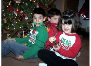 My son held mistletoe over his head while his twin sisters kissed him on each cheek simultaneously. This won honorable mention.