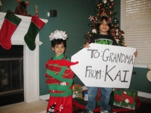 I do this everything year, but since I don't have children it's more of an adult play-on-words thing. We've dressed up with white ghost sheets on and held presents. The caption: "The Ghosts of Christmas Presents"