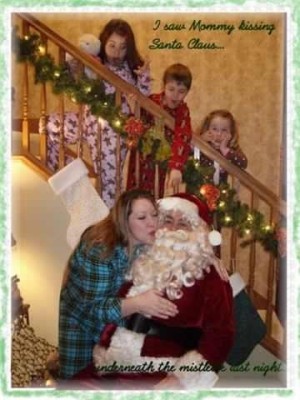 Here's is one from an idea we got off your website - we loved this idea. The kids wore their comfy pajamas and my friend borrowed us his Santa suit. My husband dressed up, I hung some mistletoe and we set up the camera. The kids did their fun little acting and we got a perfect shot. :)