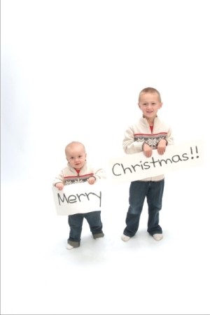 My boys, ages 1 and 2, only cried at the photo session. Every picture is quite shocking. I'm too traumatized to think of a humorous, pithy greeting to accompany our bundles of, er, joy, screaming their fool heads off for the camera. Any ideas?